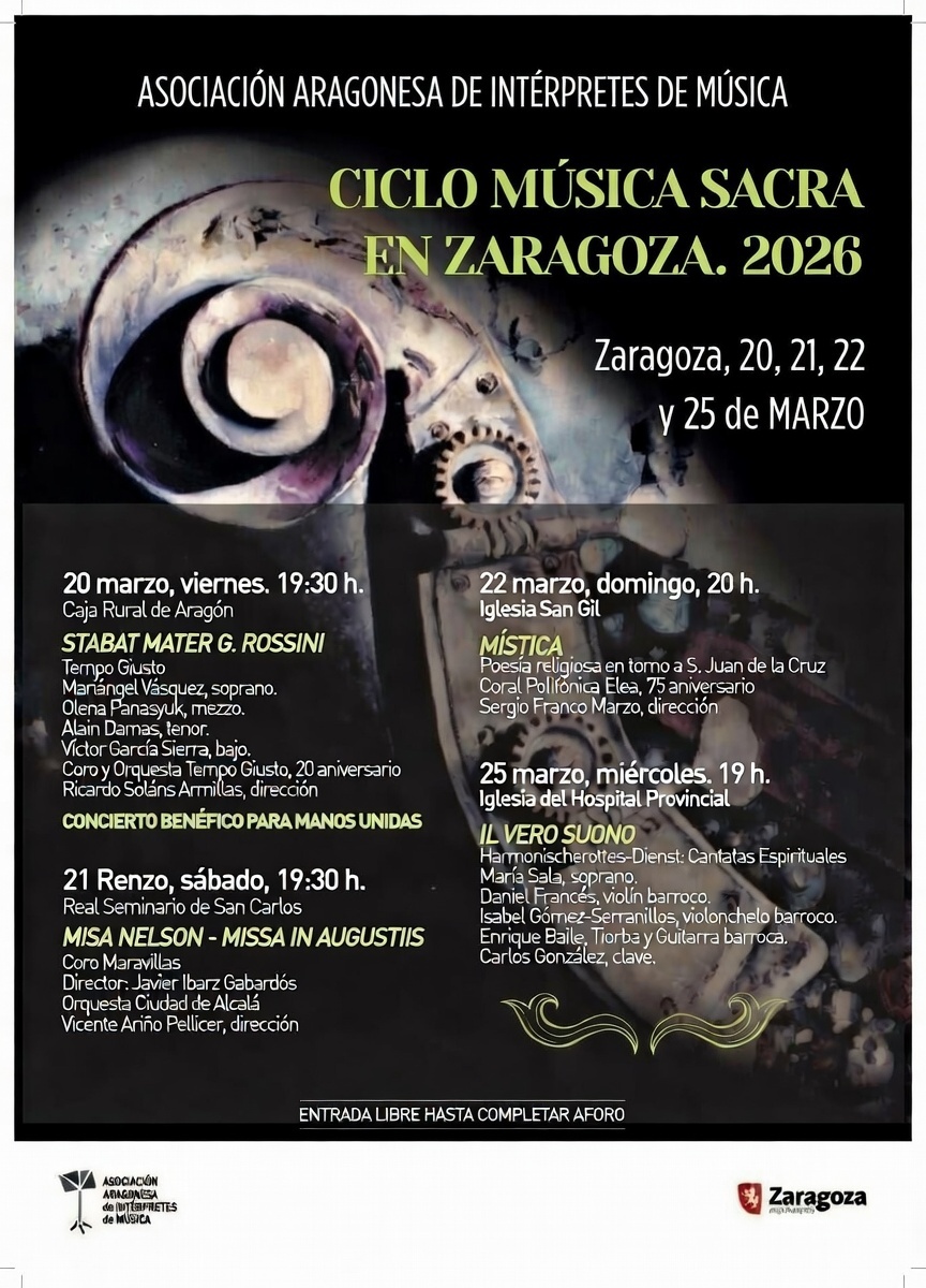 Ciclo música sacra 00 días 00 horas 00 minutos 00 segundos Fecha 20 Mar 2026 Hora 7:30 pm - 7:30 pm Más Información Programa del evento Localización Caja rural de Aragón Categoría Música sacra Programa del evento