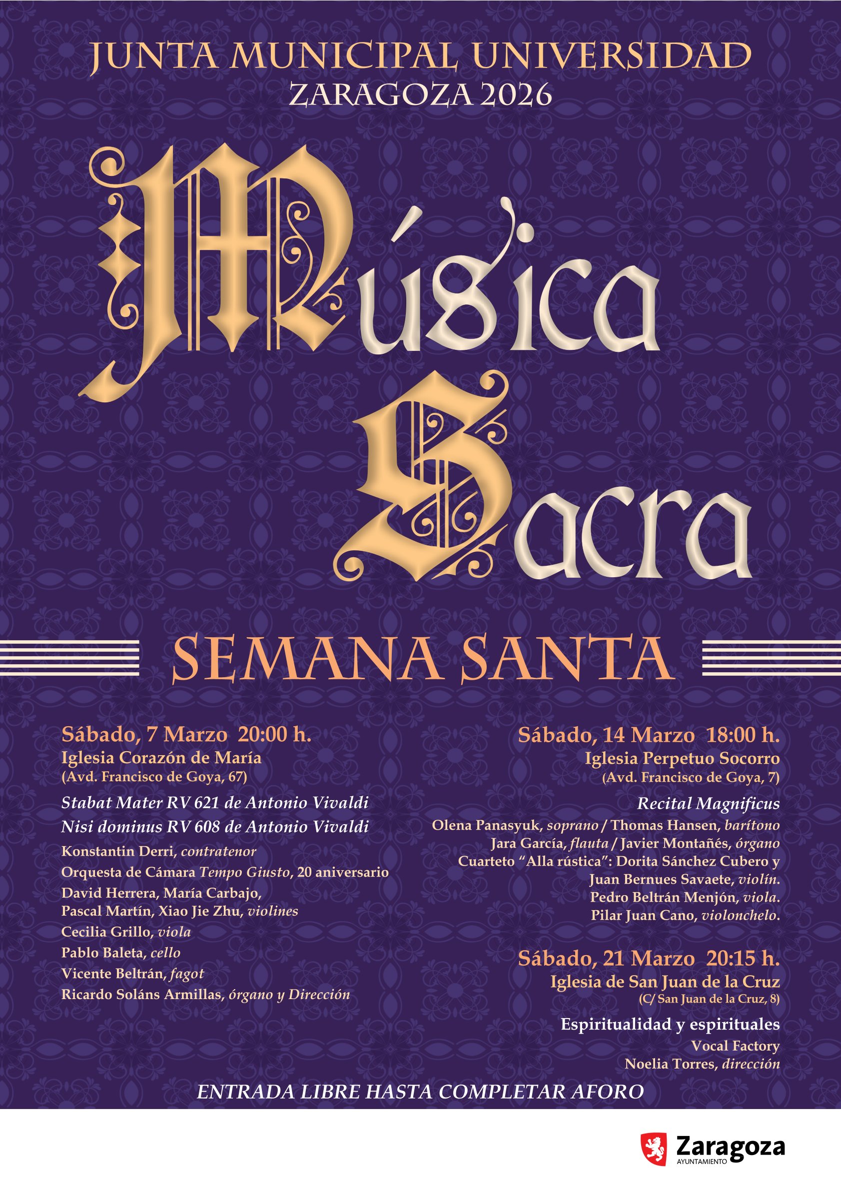 Música sacra 2026 Fecha 07 Mar 2026 Finalizdo! Hora 8:00 pm Más Información Programa del evento Localización Iglesia Corazón de María Zaragoza Categoría Música sacra